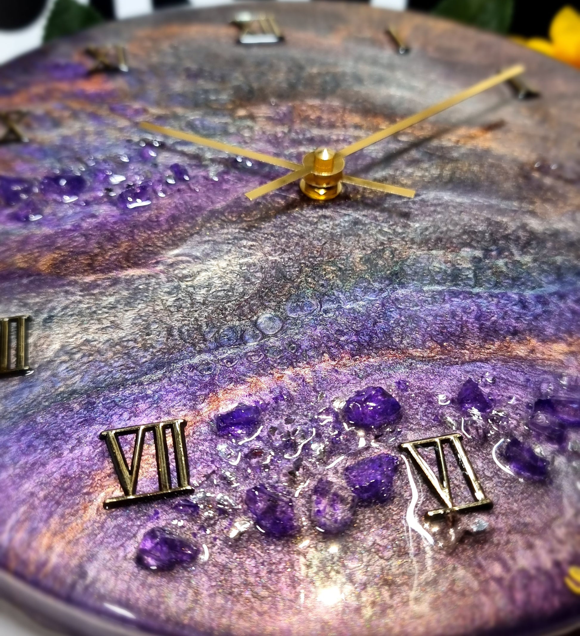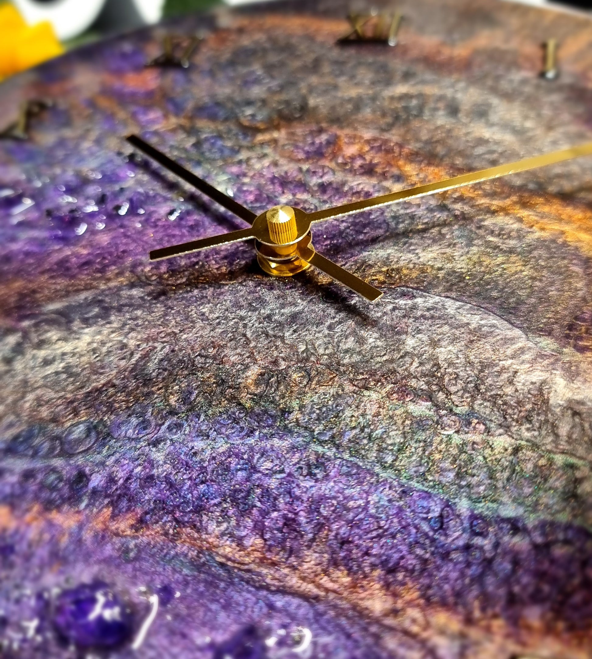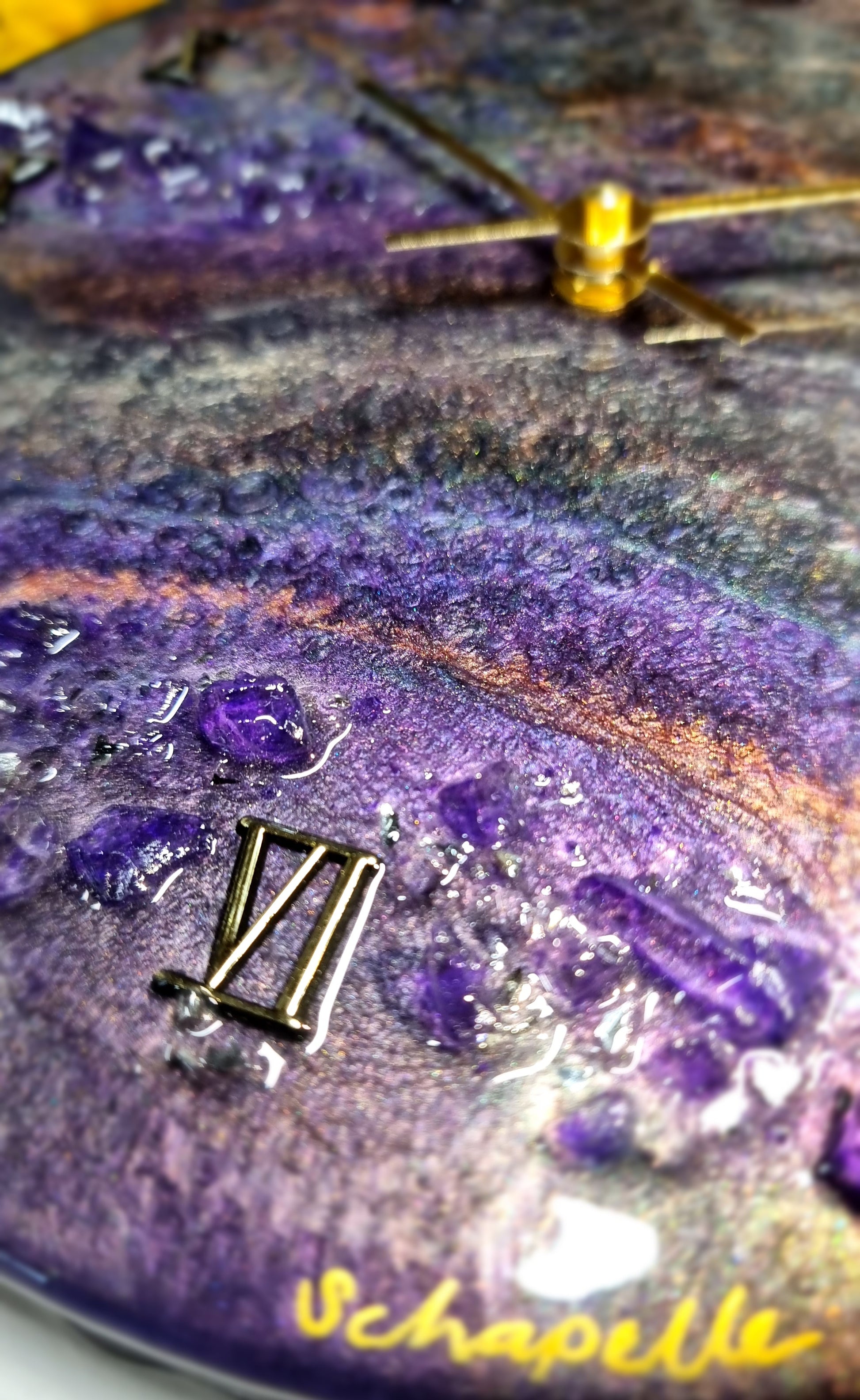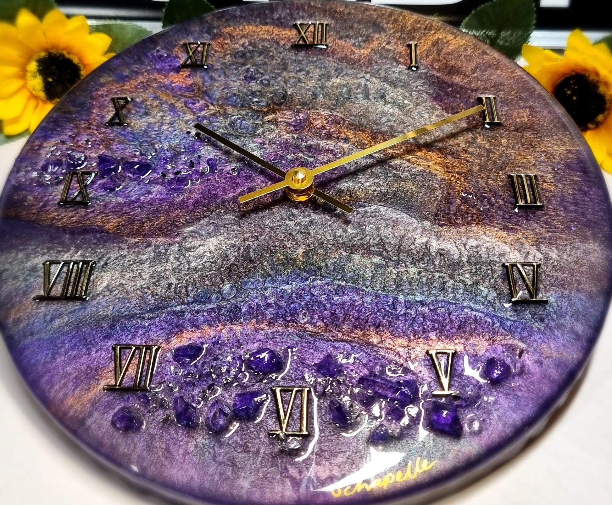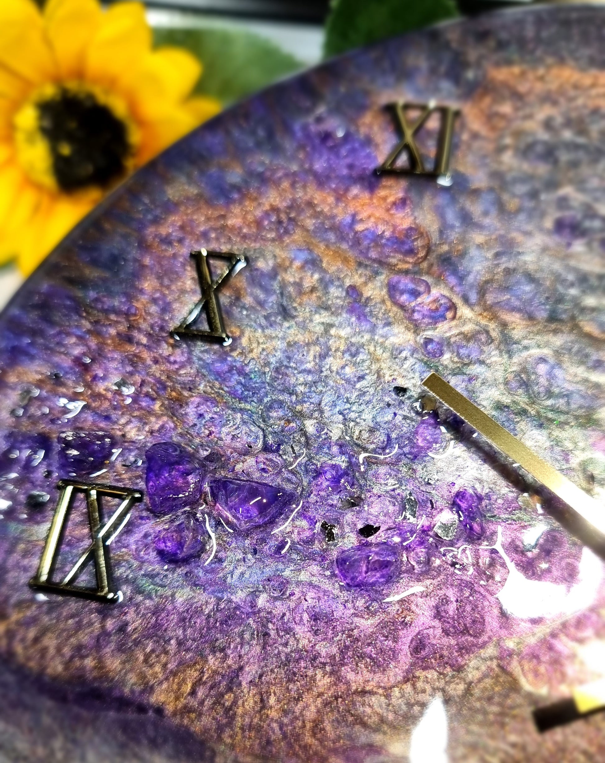 •Epoxy Resin •Wall Clock •On Wood •Colours= Purple,Gold,Green,Champagne •Broken Purple Glass Stones,Broken Mirror Glass Details •Quartz Clock Mechanism •Silent •Quality Gold Hands •Gold Roman Numerals Complete •Epoxy UV Protected •Ready To Hang •Size=28cmx2cm Regular •Signed And Numbered •Free Shipping Australia Wide