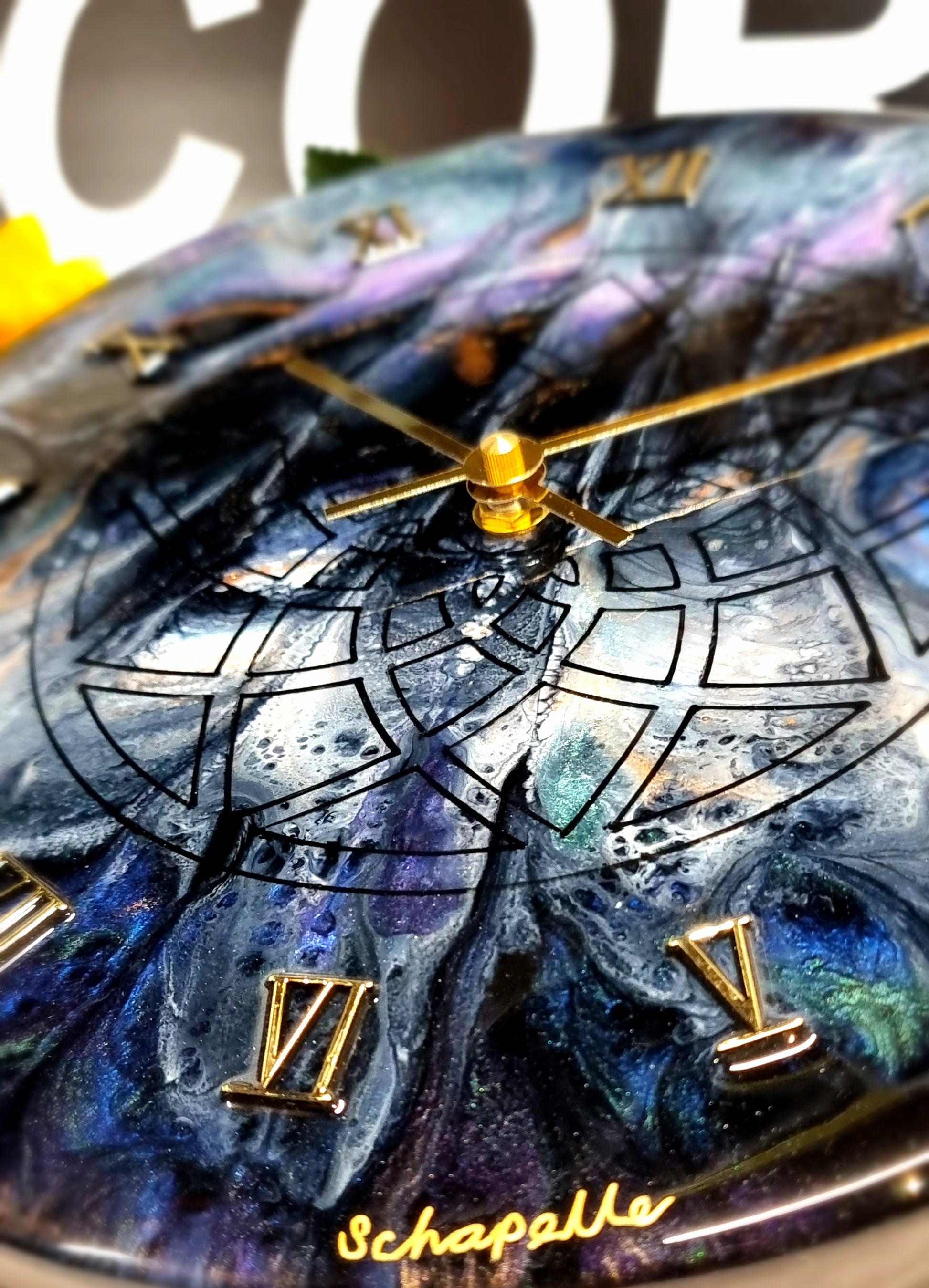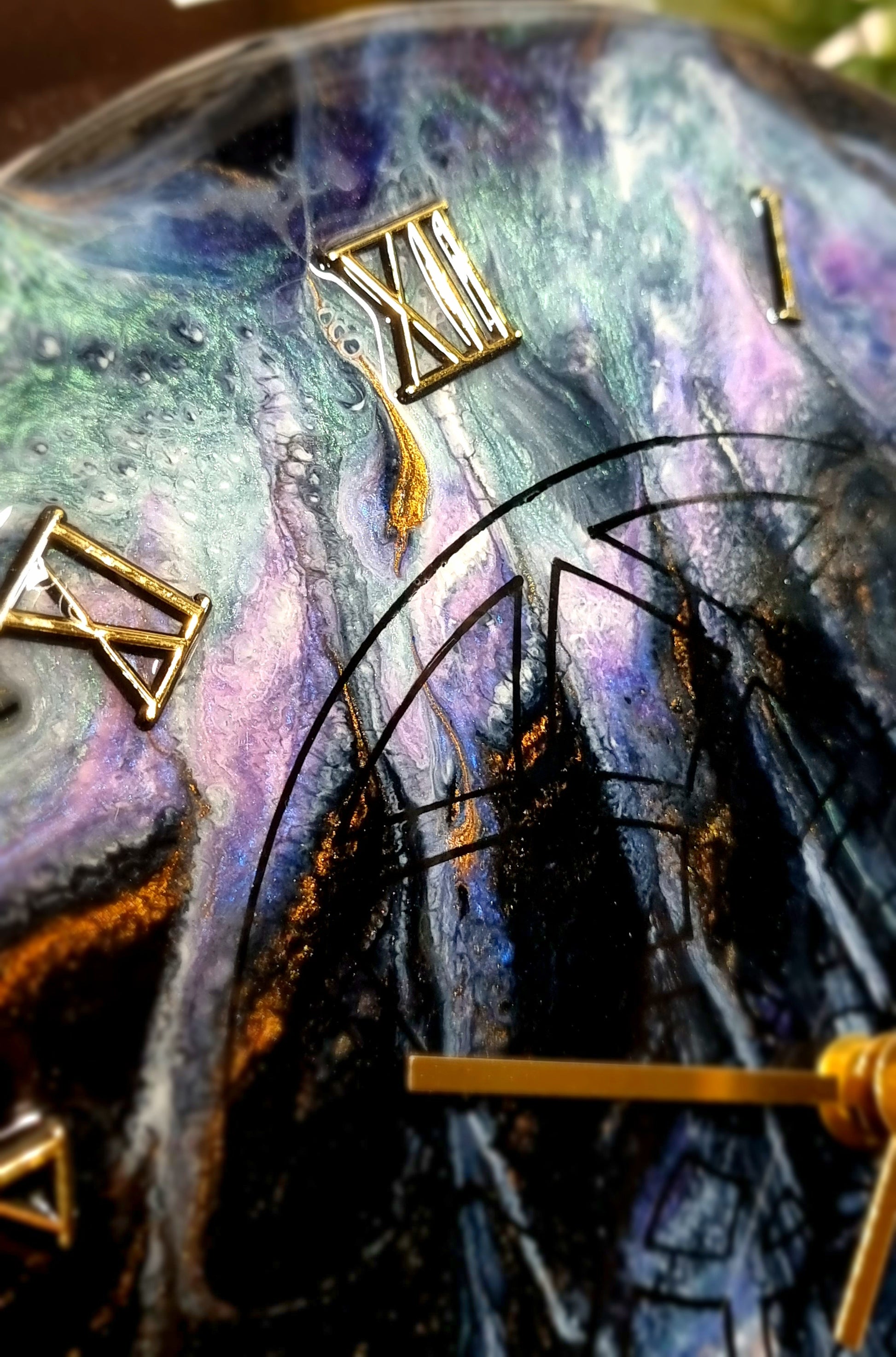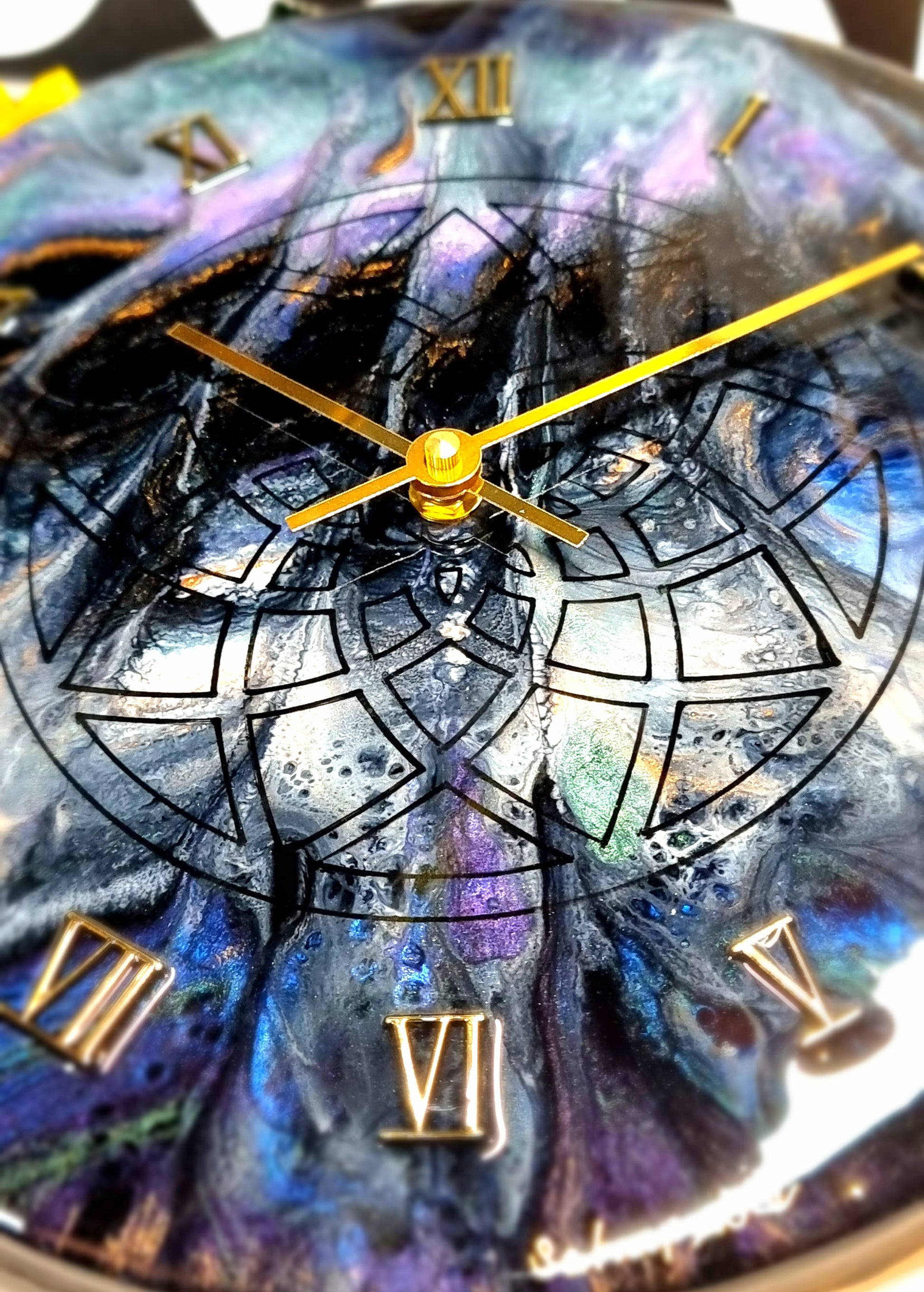 •Epoxy Resin •Wall Clock •On Wood •Colours= Black, White, Green, Blue,Purple, Gold Shimmer •Sacred Geometry Drawn •Gold Roman Numerals Complete •Quartz Clock Mechanism •Silent •Quality Gold Hands •Epoxy UV Protected •Ready To Hang •Size=28cmx2cm Regular •Signed And Numbered •Free Shipping Australia Wide