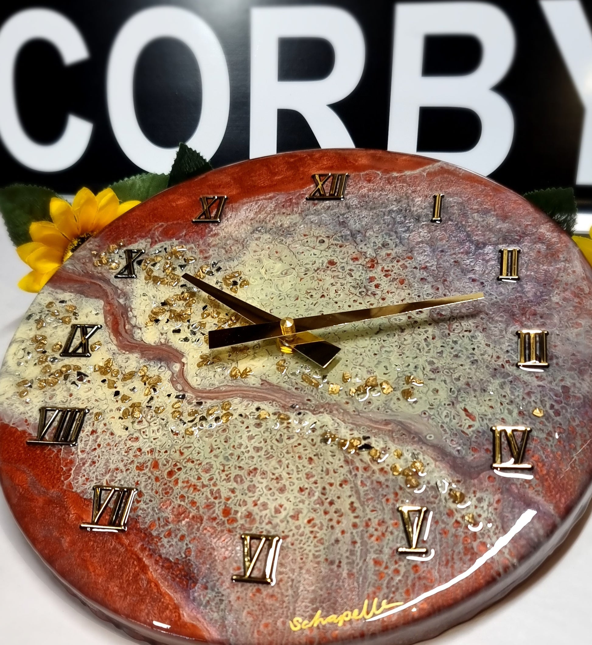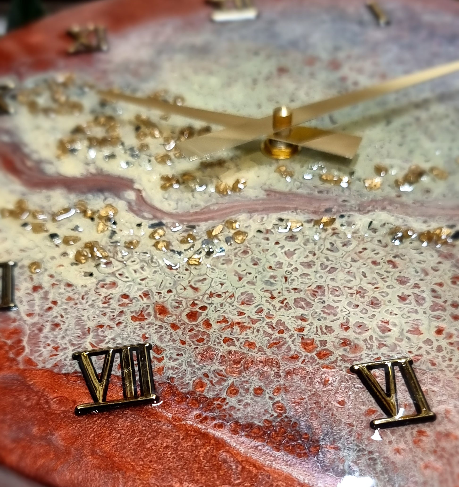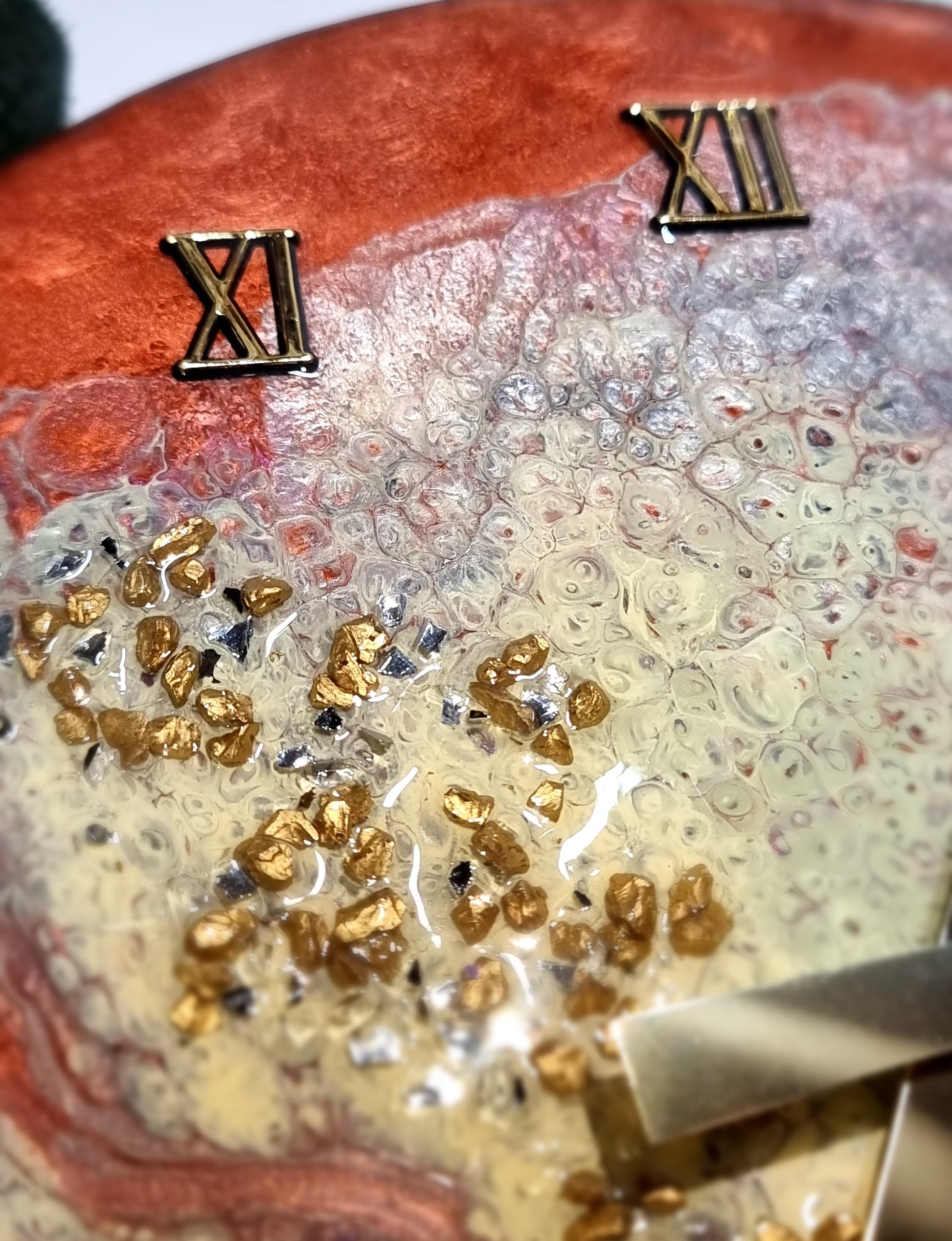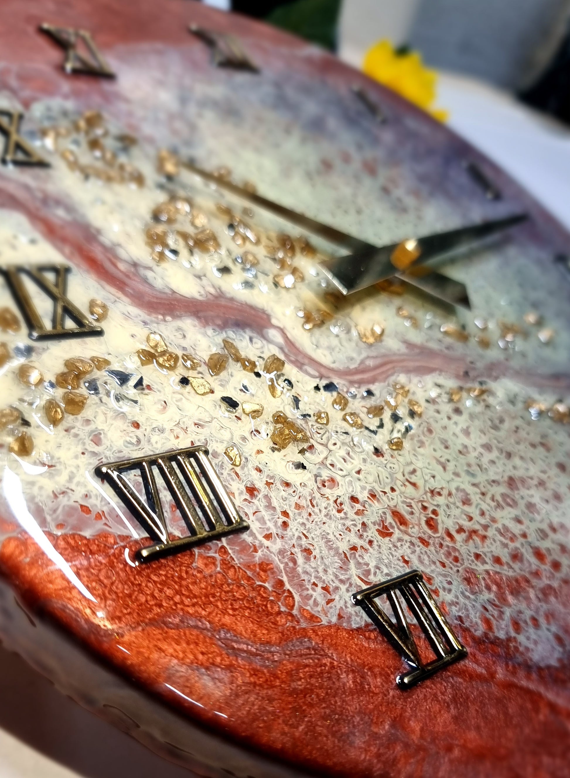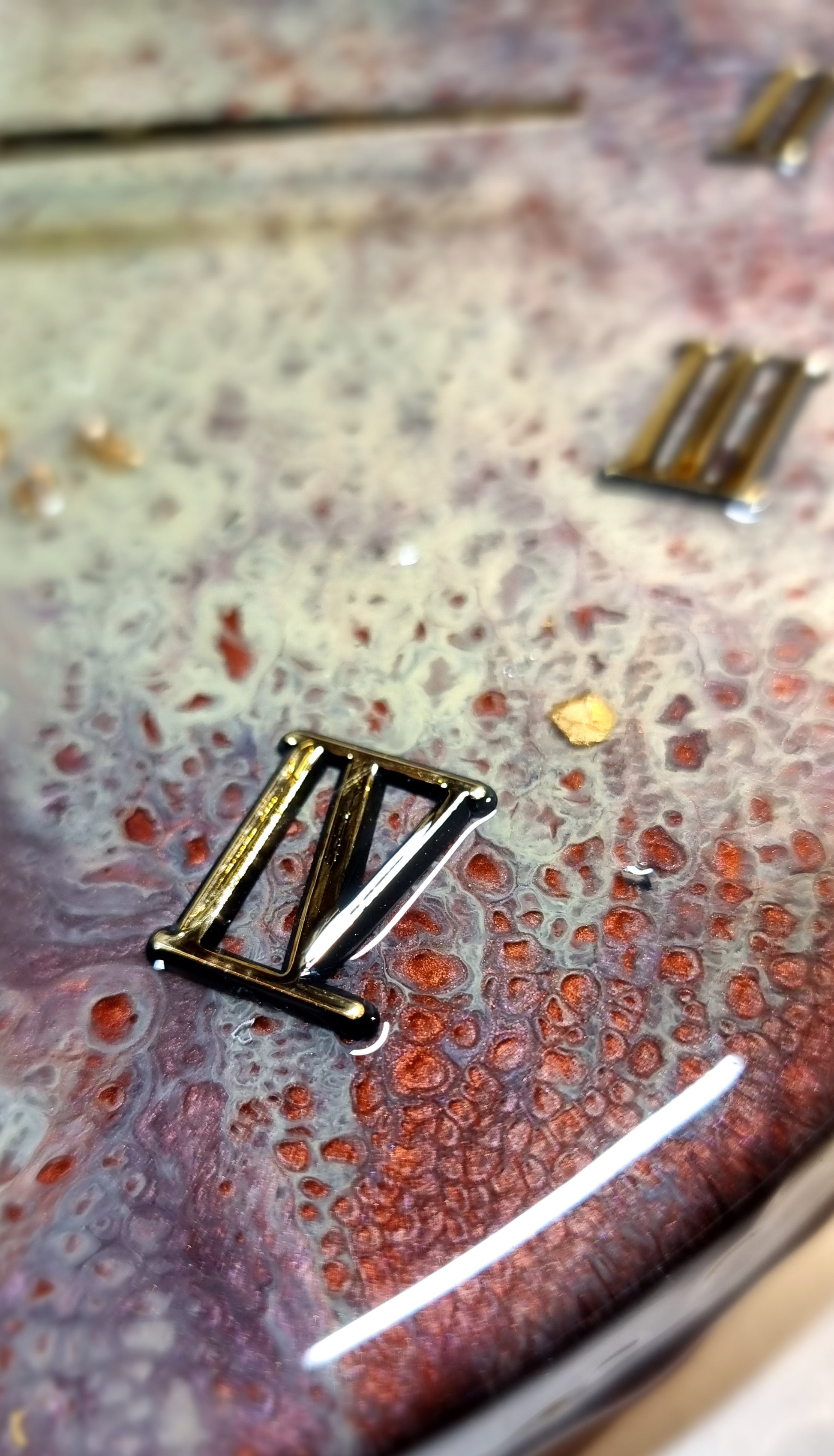 •Epoxy Resin •Wall Clock •On Wood •Colours= Copper,Purple,Acacia,Banksia •Gold Pebble Stones & Broken Mirror Glass Details •Quartz Clock Mechanism •Silent •Quality Gold Hands •Gold Roman Numerals Complete •Epoxy UV Protected •Ready To Hang •Size=28cmx2cm Regular •Signed And Numbered •Free Shipping Australia Wide
