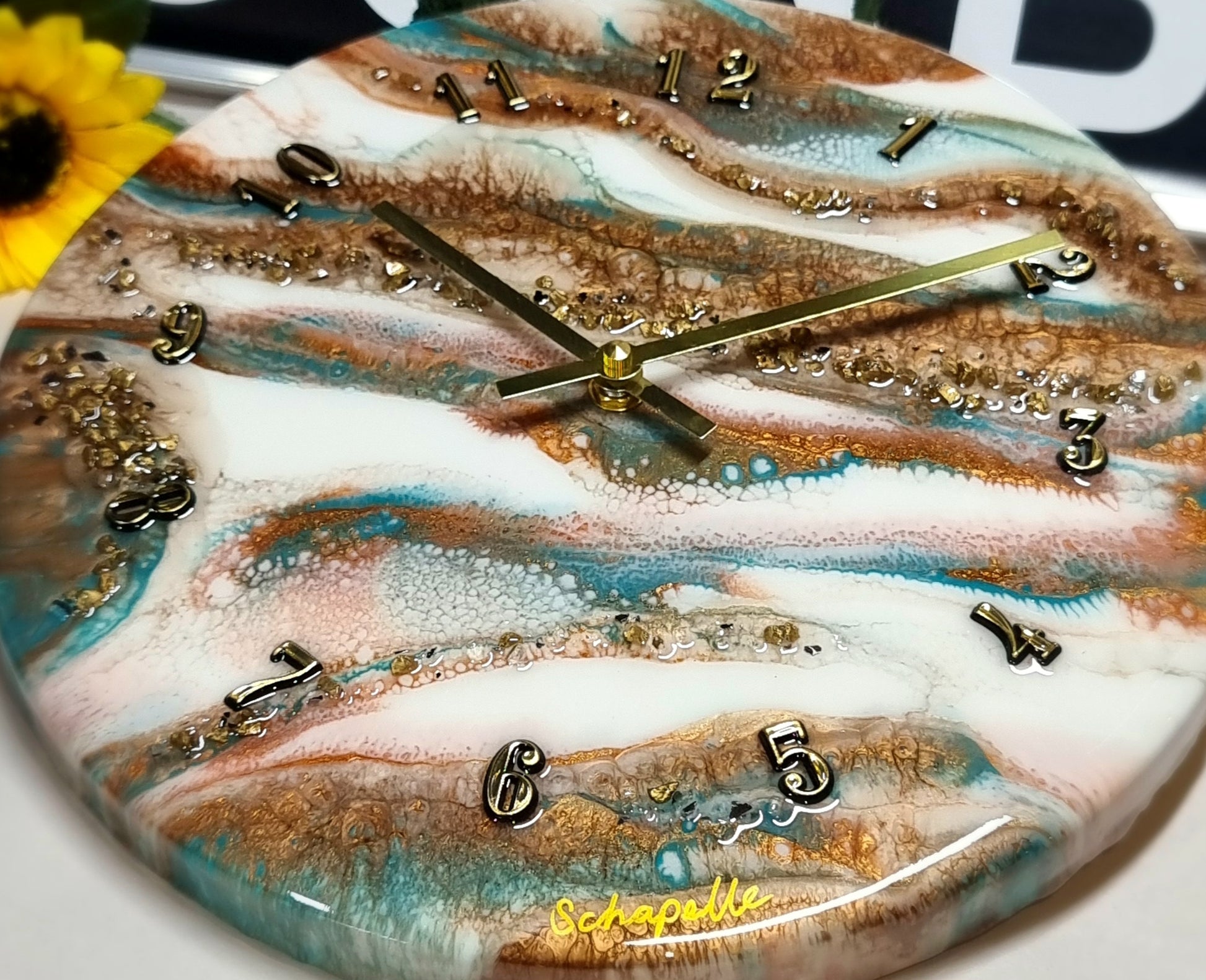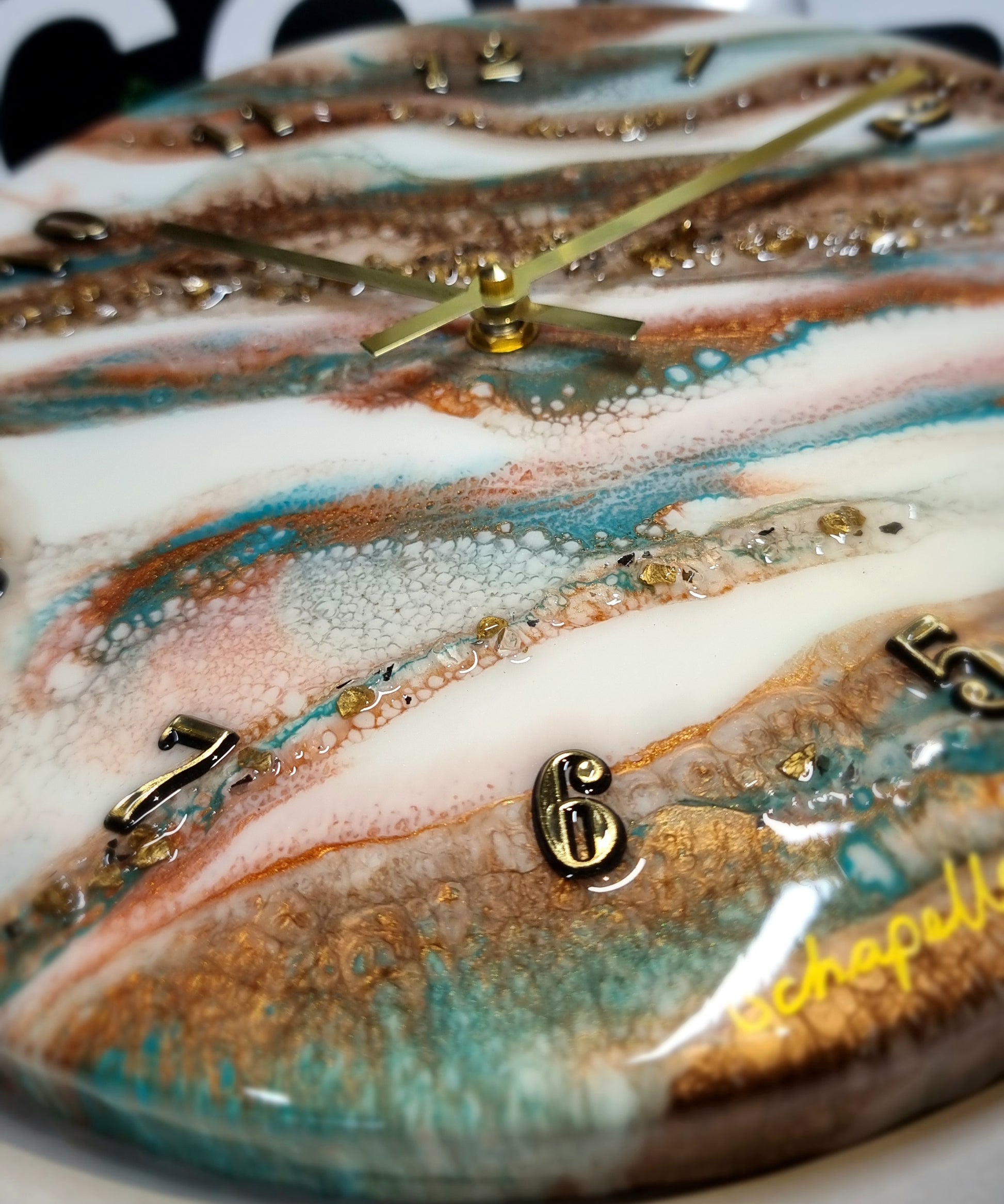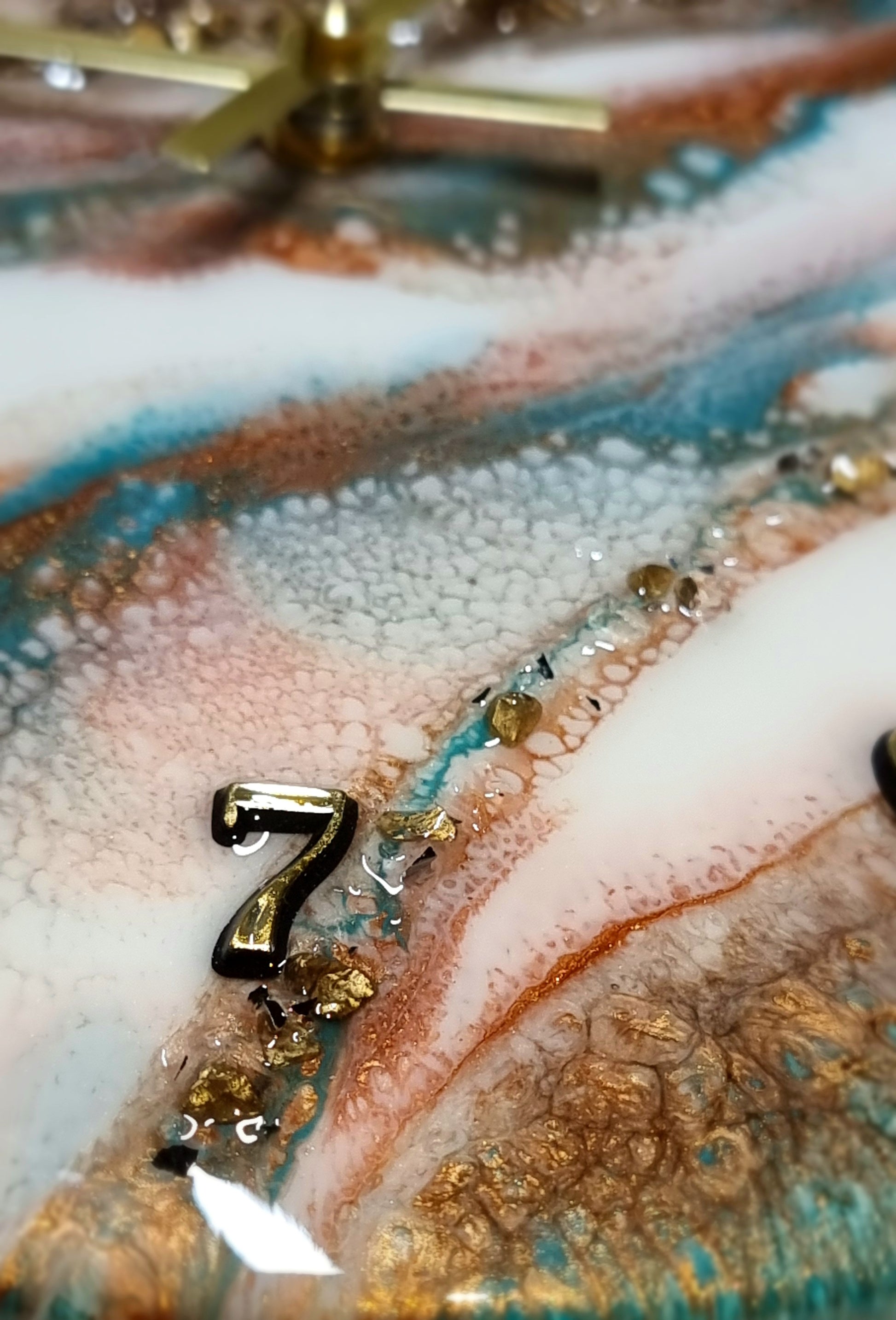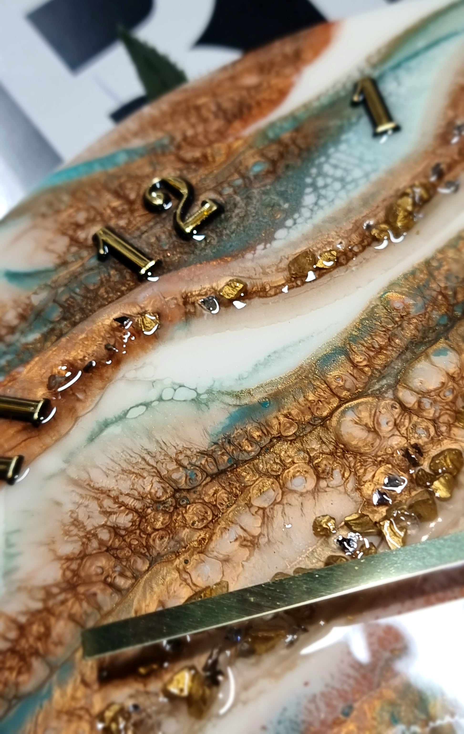 •Epoxy Resin •Wall Clock •On Wood •Colours= White,Teal,Gold •Broken Mirror Glass & Gold Stones Details •Quartz Clock Mechanism •Silent •Quality Gold Hands •Gold Numbers Complete •Epoxy UV Protected •Ready To Hang •Size=28cmx2cm Regular •Signed And Numbered •Free Shipping Australia Wide •Made With Love By Myself 💙