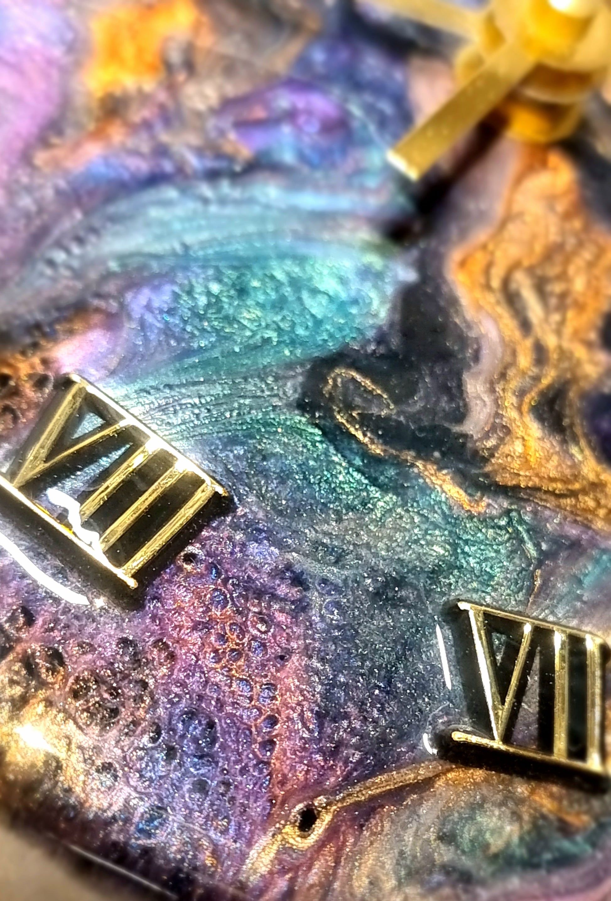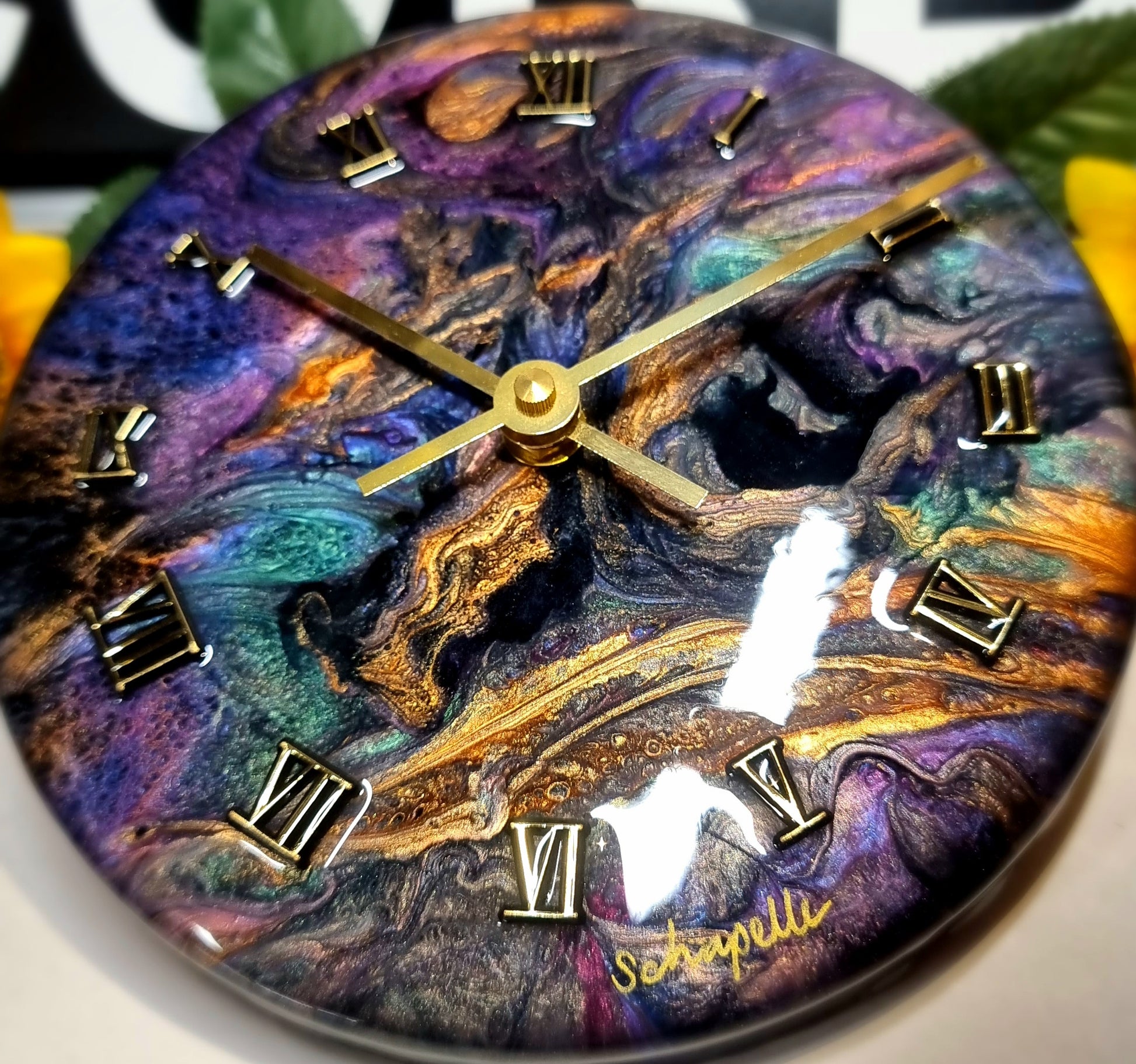 •Epoxy Resin •Wall Clock •On Wood •Colours=Black, White,Gold,Green,Blue,Purple, Cherry •Quartz Clock Mechanism •Silent •Quality Gold Hands •Gold Roman Numerals Complete •Epoxy UV Protected •Ready To Hang •Size=18cmx2cm Small •Perfect For Smaller Spaces Or Work Desk Top Space •Will Recieve A Complimentary Clock Display Stand •Signed And Numbered •Free Shipping Australia Wide
