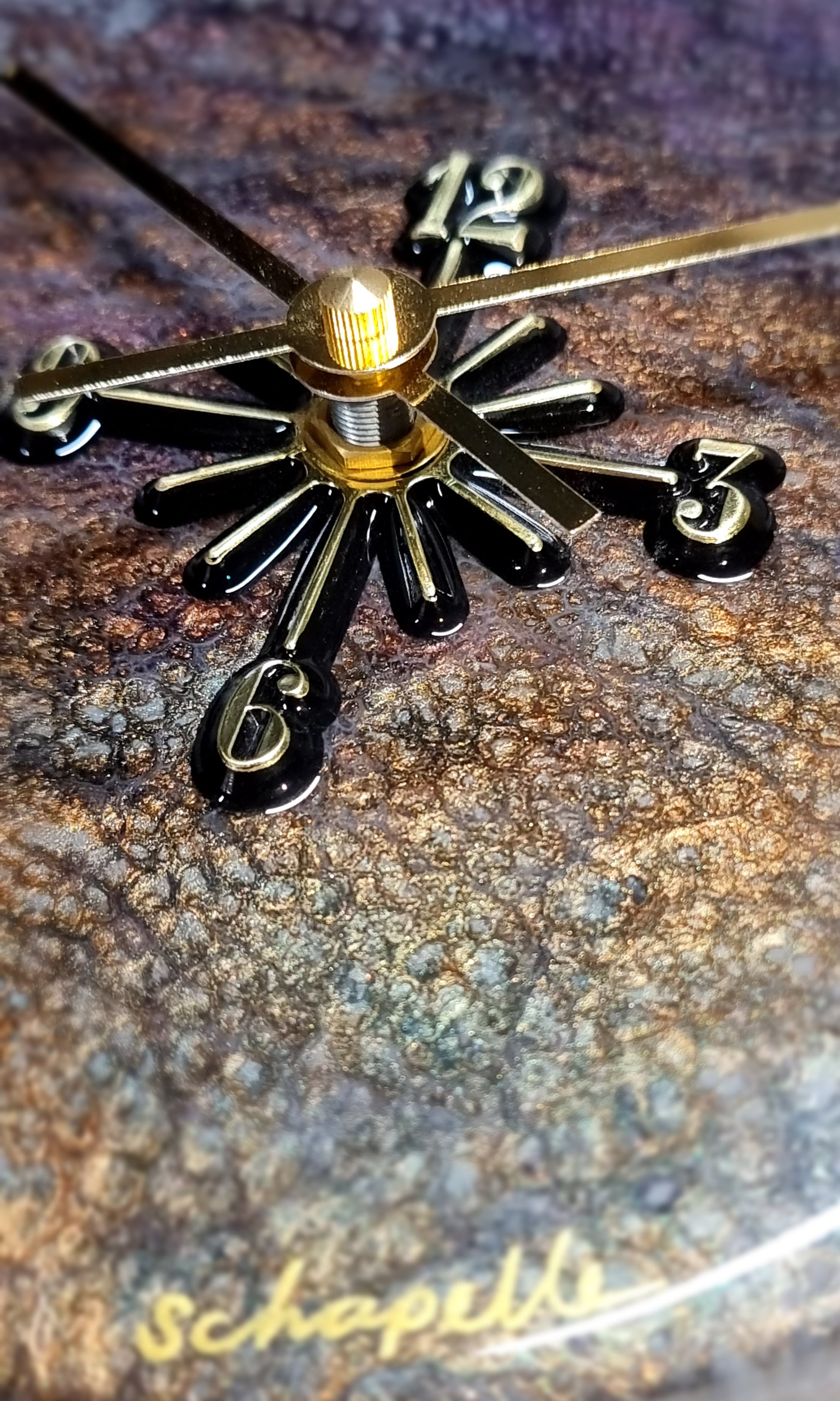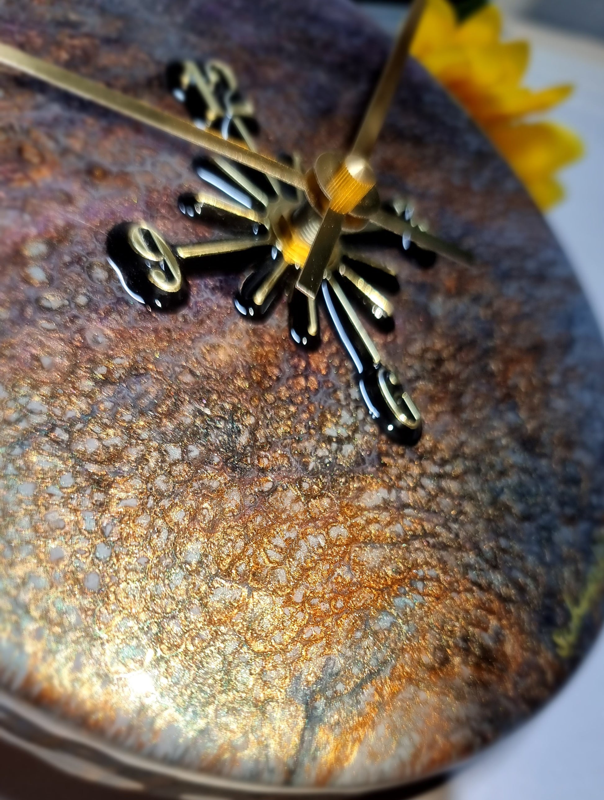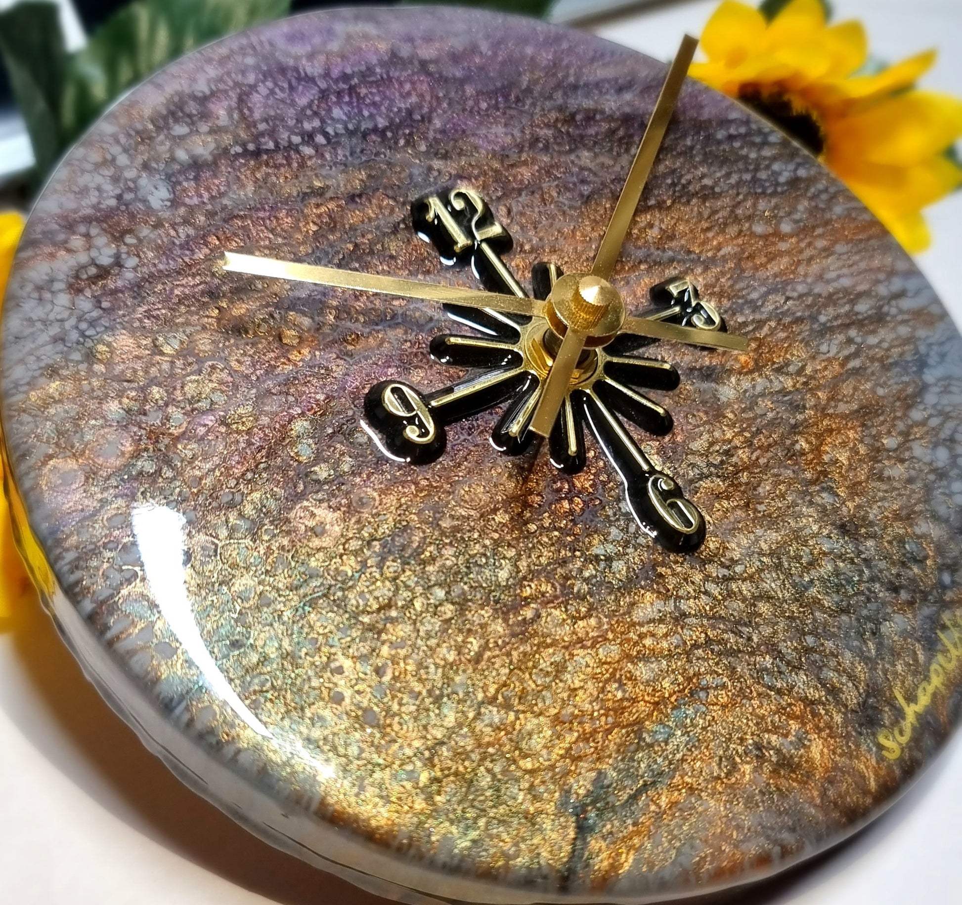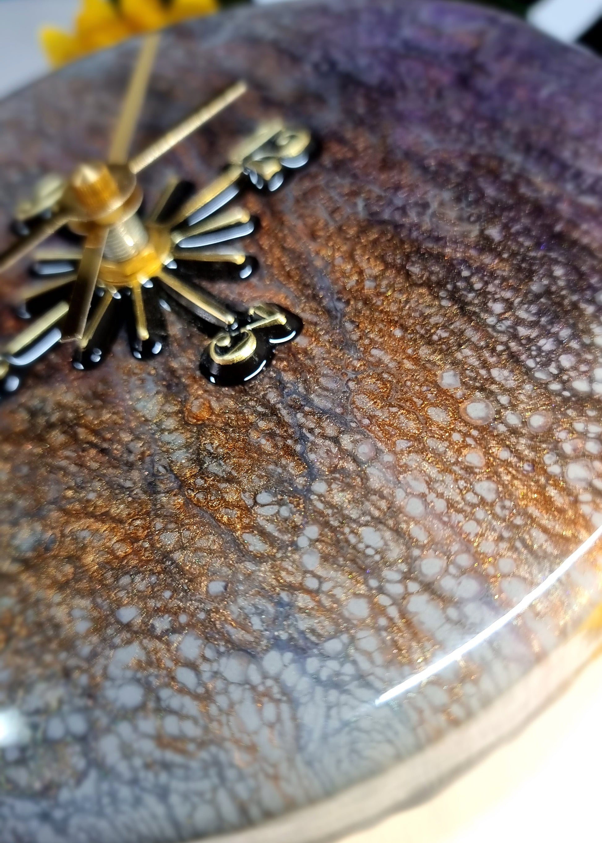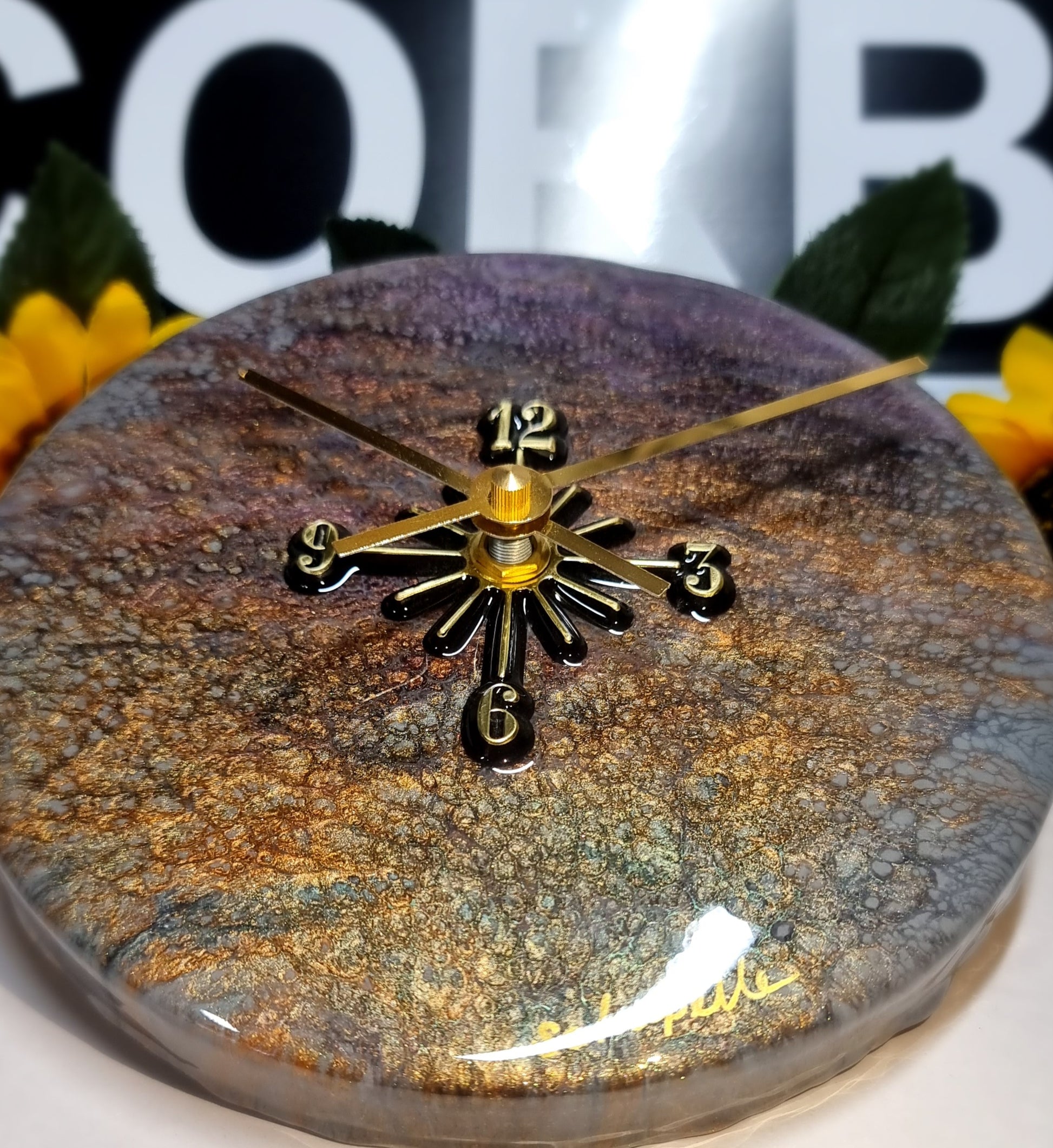 •Epoxy Resin •Wall Clock •On Wood •Colours=Grey,Purple,Chameleon •Quartz Clock Mechanism •Silent •Gold Number Star •Quality Gold Hands •Epoxy UV Protected •Ready To Hang •Size=18cmx2cm Small •Perfect For Smaller Spaces Or Work Desk Top Space •Will Recieve A Complimentary Clock Display Stand •Signed And Numbered •Free Shipping Australia Wide