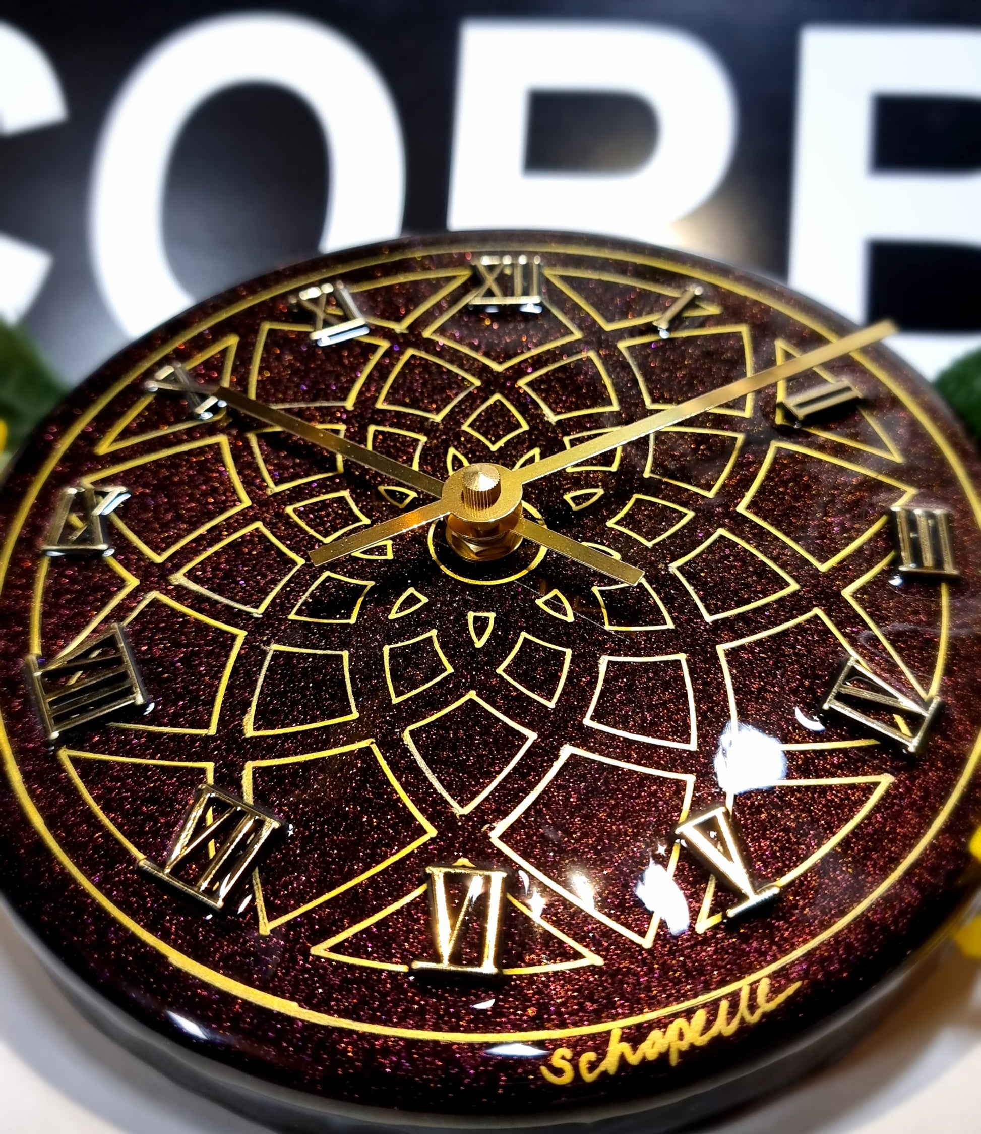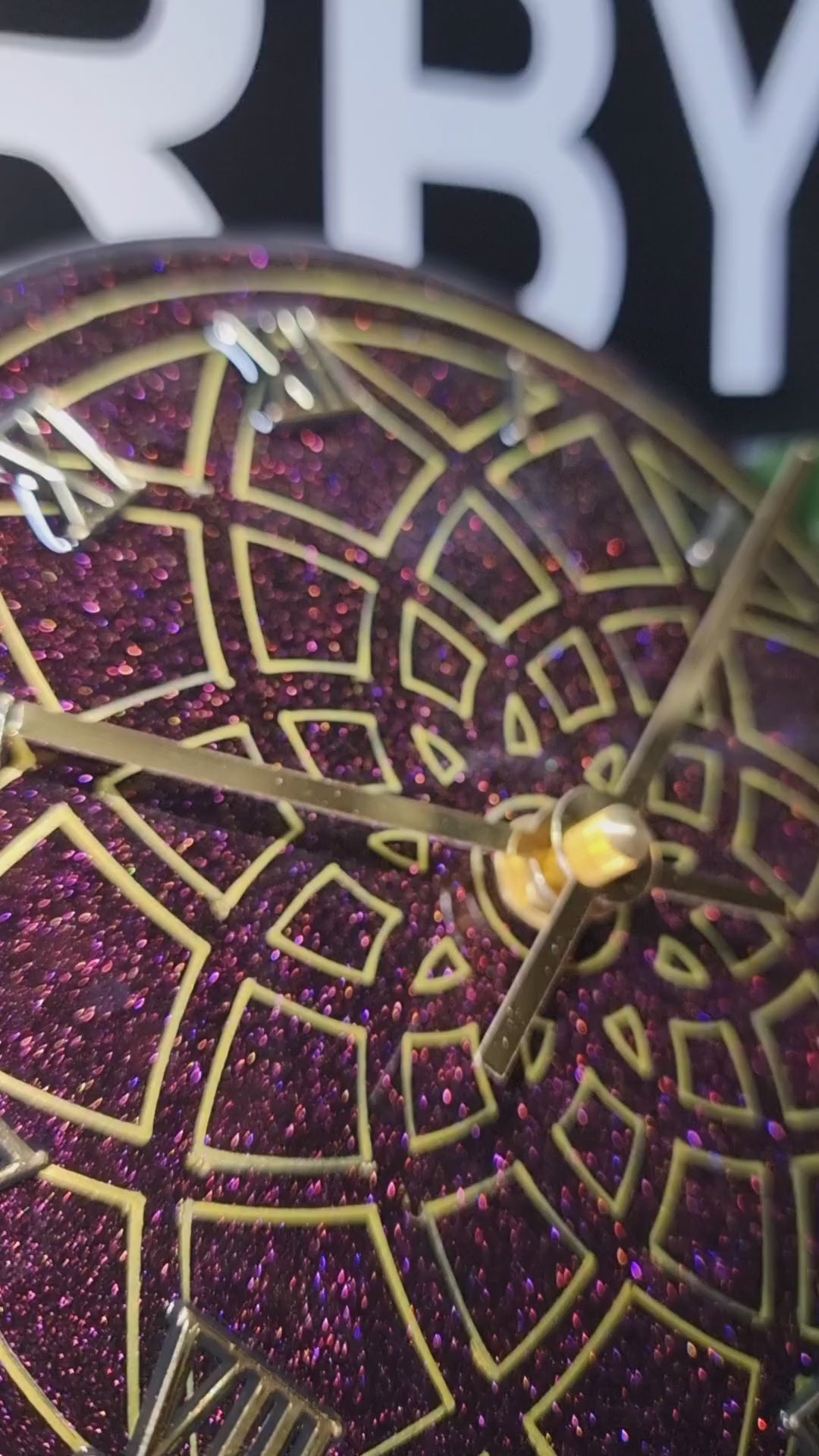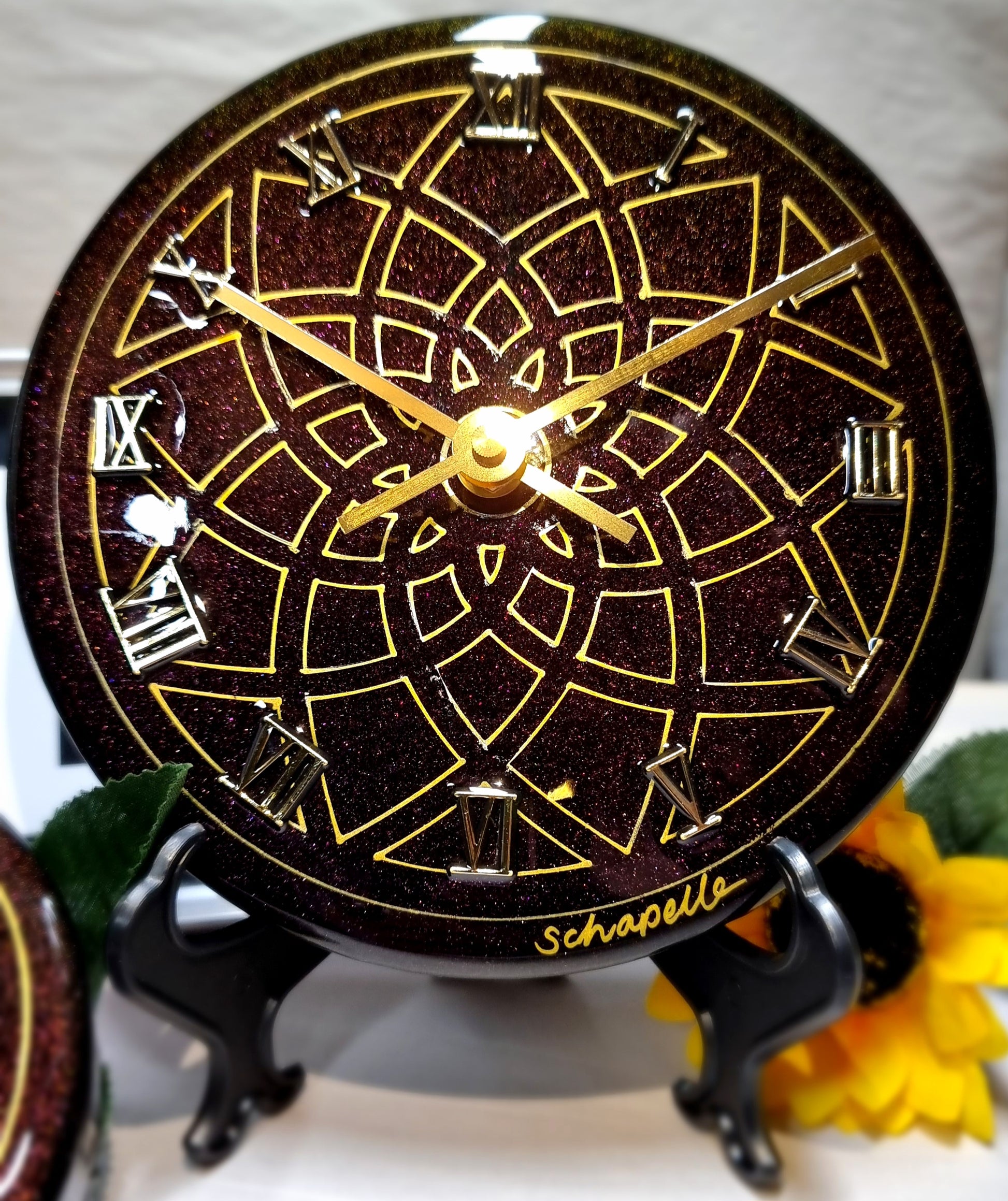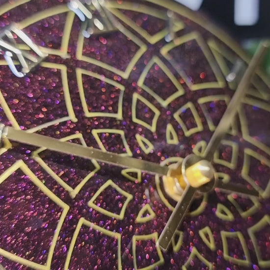 •Epoxy Resin •Wall Clock •On Wood •Colours= Chameleon-Purple,Gold,Maroon,Green- •Hand Drawn Sacred Geometry •Quartz Clock Mechanism •Silent •Quality Gold Hands •Roman Numerals Complete •Epoxy UV Protected •Ready To Hang •Size=18cmx2cm Small •Perfect For Smaller Spaces Or Work Desk Top Space •Will Recieve A Complimentary Clock Display Stand •Signed And Numbered •Free Shipping Australia Wide